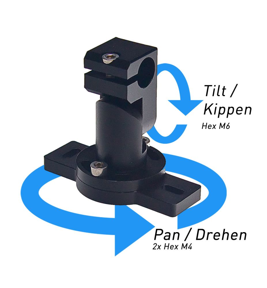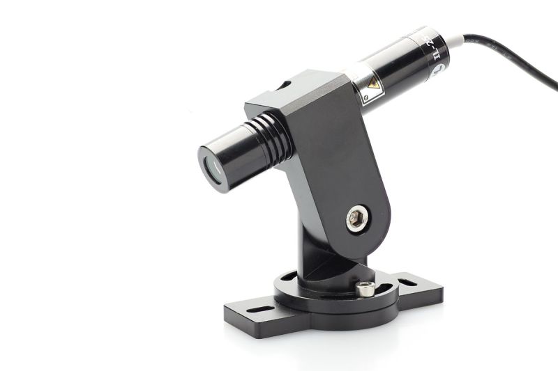 Das zylindrische Gehäuse mit einem Durchmesser von 18 mm lässt sich leicht in die eigens hierfür konstruierte, justierbare Halterung setzen. Hierbei wird der Linienlaser geklemmt, damit das Gehäuse nicht beschädigt wird. Gleichzeitig wird auch die erzeugte Wärmeleistung, die jedoch bei diesen Modulen sehr gering ist, über die Klemmung an eine metallische Fläche abgeführt. Die Linienlage wird einfach durch Verdrehung des Lasermoduls in der Halterung eingestellt. Die stabile Halterung aus Aluminium lässt sich in Pan und Tilt einstellen und festklemmen. Im Montagefuss sitzt zusätzlich ein Führungsstift für den sauberen Rundlauf während des Justagevorgangs. Die Montageplatte lässt eine Befestigung von vorne als auch von hinten über Gewindeeinsätze zu.